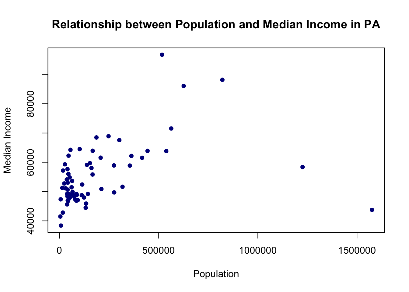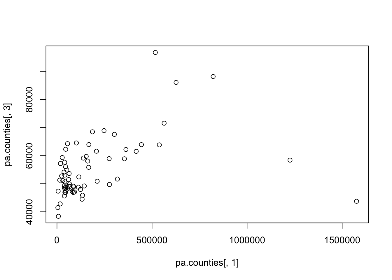#> [6,] 12.47843 0.3038048How might we visualize the relationship between the population of a county and the median income of that county?