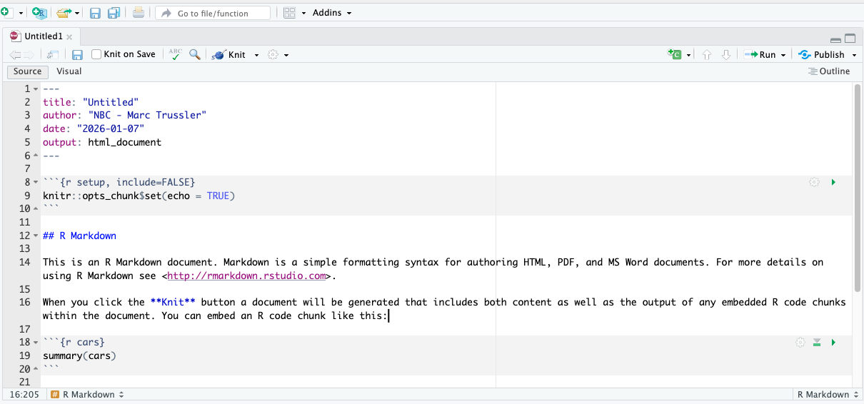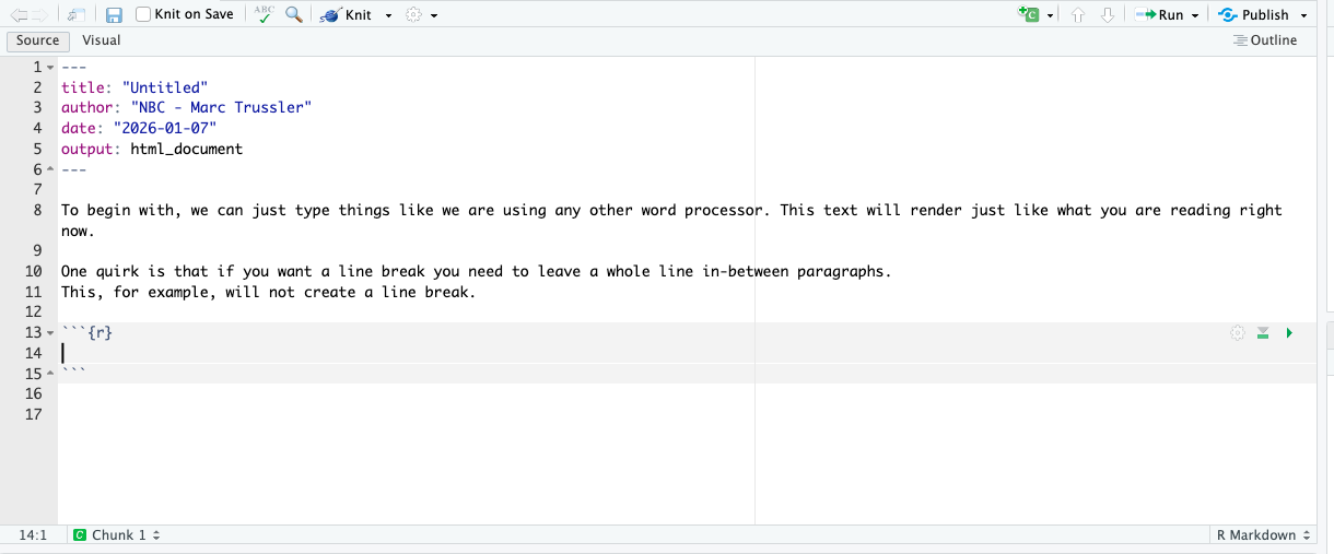 You can think of a code chunk exactly the same as a normal R script. All the rules of R coding apply within that chunk. The difference is that when we render our file, that chunk will be displayed, it will be evaluated, and the result will be rendered.