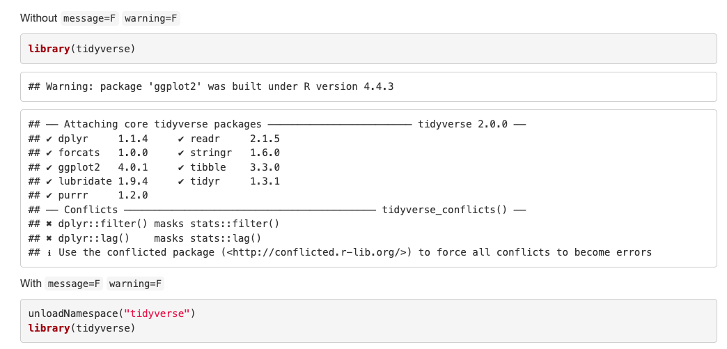 c+2*v^2Other options we might want to add to our code chunks are warning=F, which suppreses warnings from packages, message=F, which suppress messages like “this package has loaded”. We can stack together multiple of these options just by using commas.