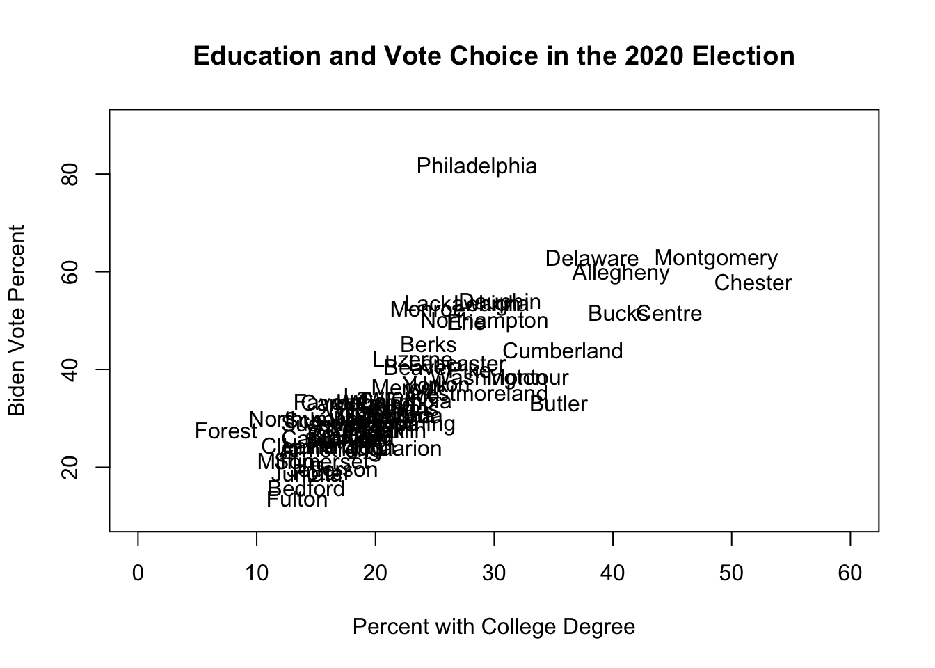 There is a clear, positive, relationship between the percent of people in a county with a college degree and the percent of votes that went to Biden in the 2020 election. In particular, there is a cluster of highly educated (mostly suburban) counties that also voted strongly for Biden. The one outlier to this relationship is Philadelphia: it is middle of the pack in terms of education, but is far-and-away the most Biden-voting county.