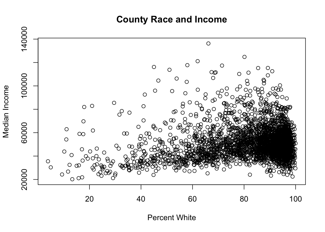plot(avg.income, avg.poverty, main="Income Level vs. Poverty Rates",