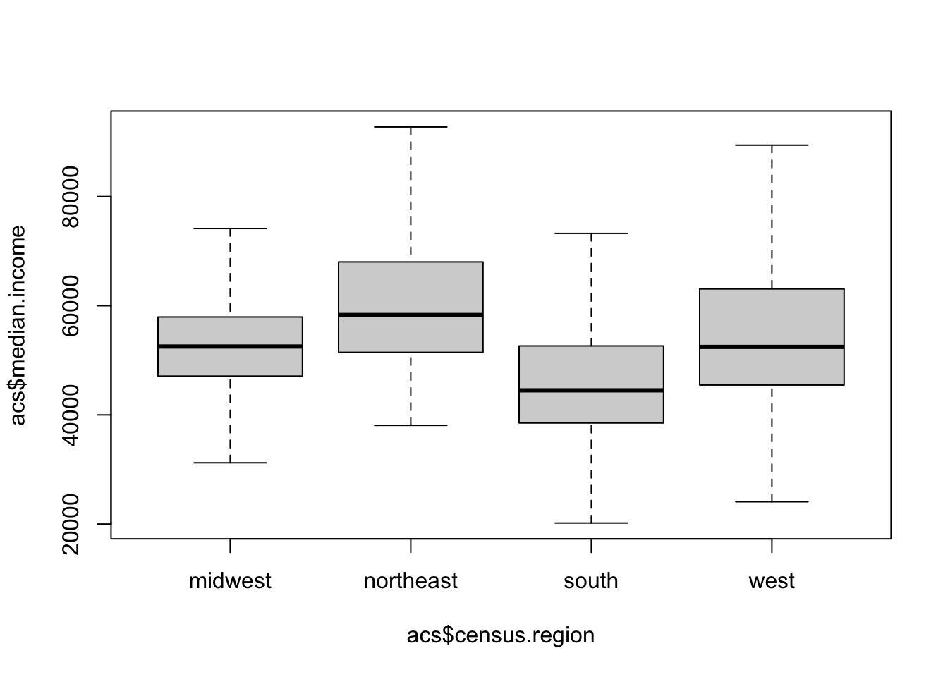 boxplot(acs$median.income ~ acs$census.region, outline=F)