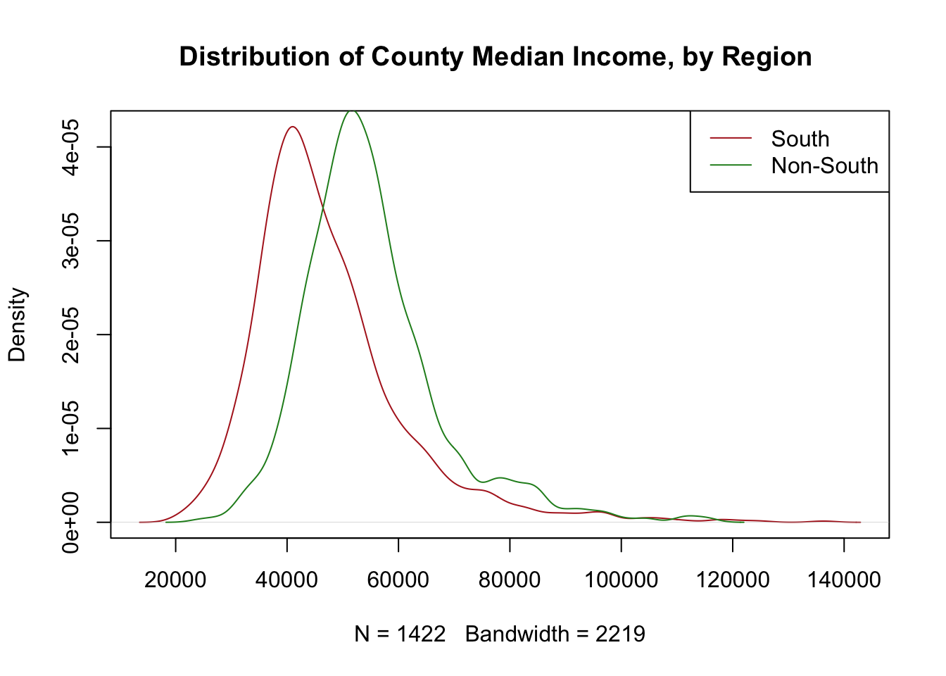 legend("topright", c("South","Non-South"), lty=c(1,1), col=c("firebrick","forestgreen"))