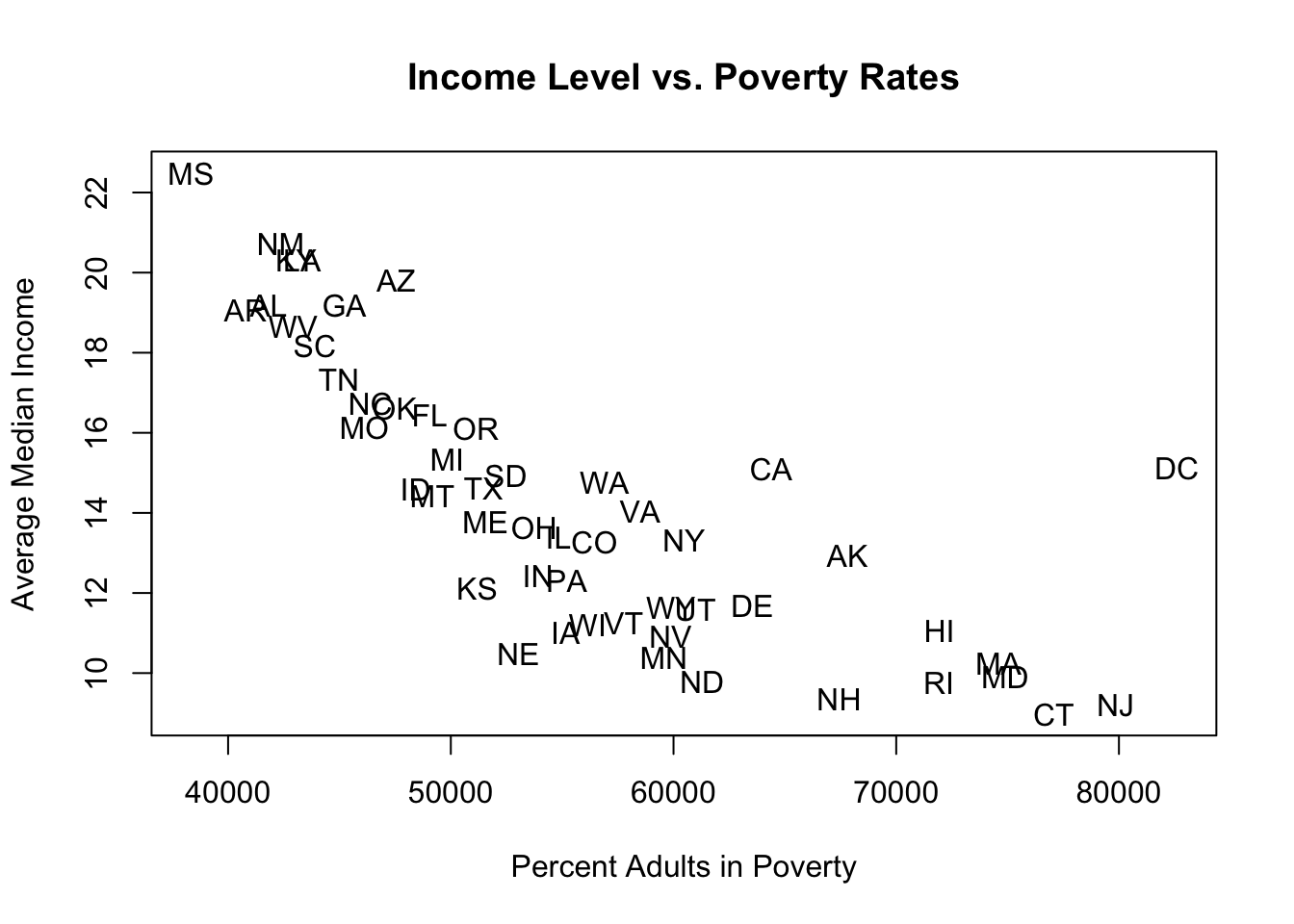 ylab="Average Median Income", xlab = "Percent Adults in Poverty",