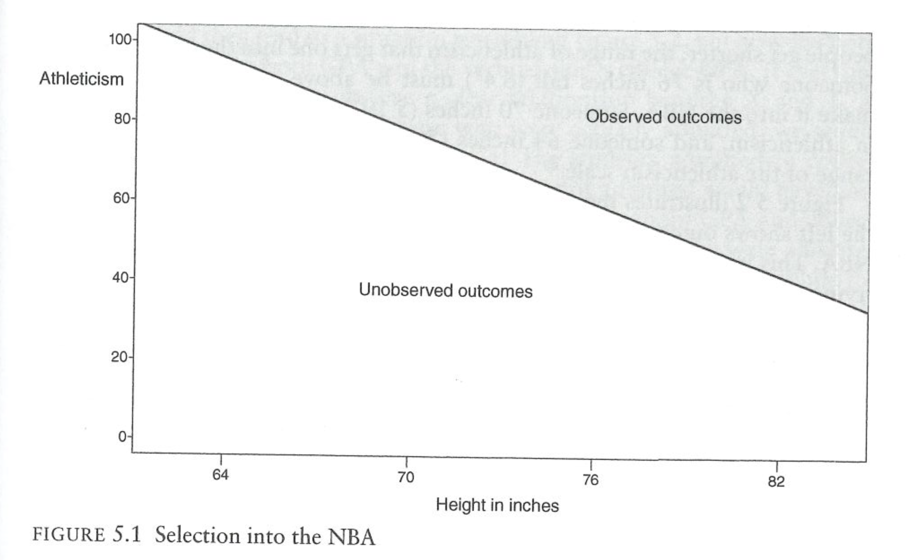 The only people who make into the NBA are those that are either very tall and at least moderately athletic (Shaq), or are not that tall and are extremely athletic (Allen Iverson). We don’t observe short people in the NBA and we don’t observe non-athletic people in the NBA.