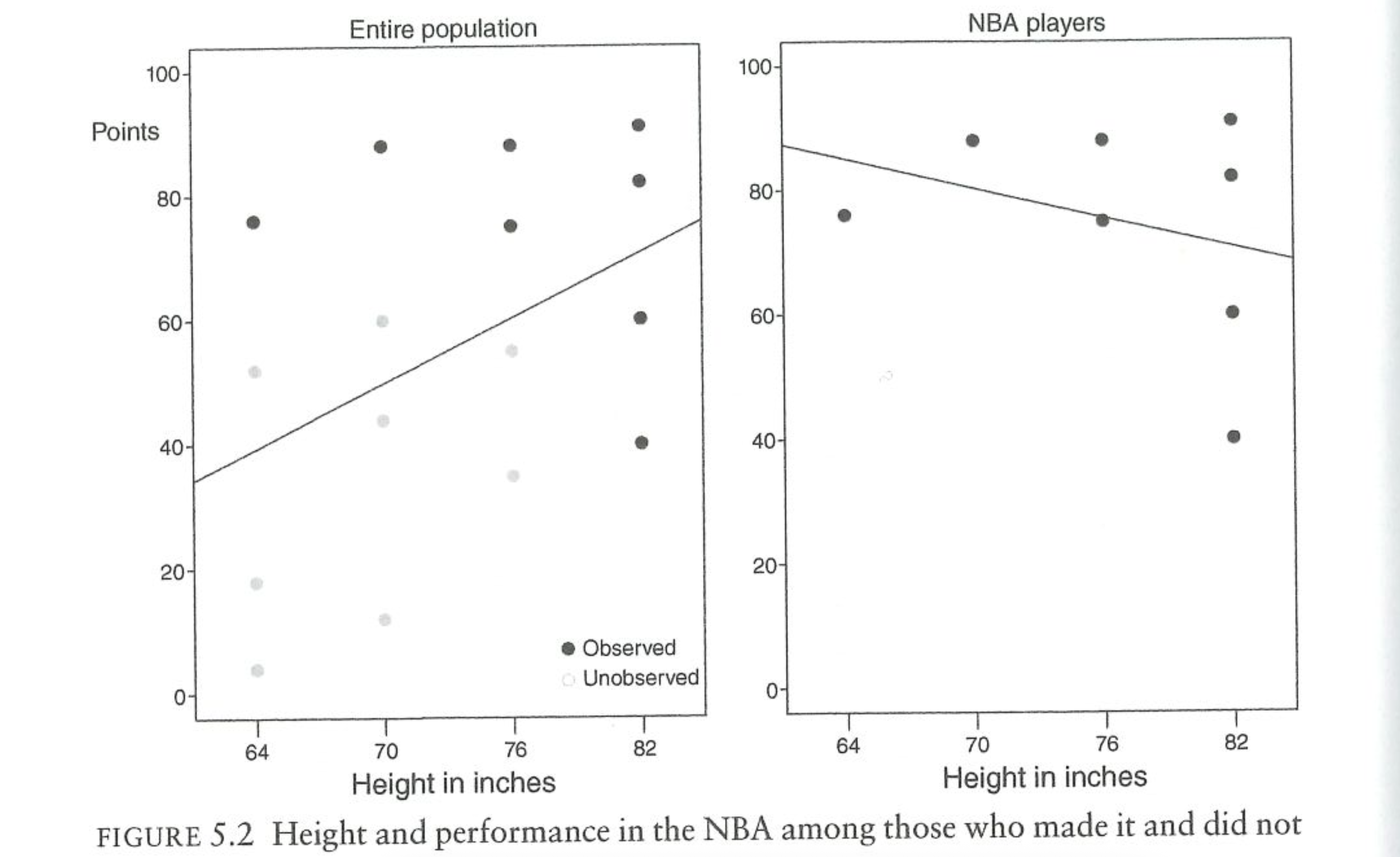 However, the only data that we get on “points scored in the NBA” is among people who play in the NBA. Selection into the sample is being driven by two key variables: height and athleticism.