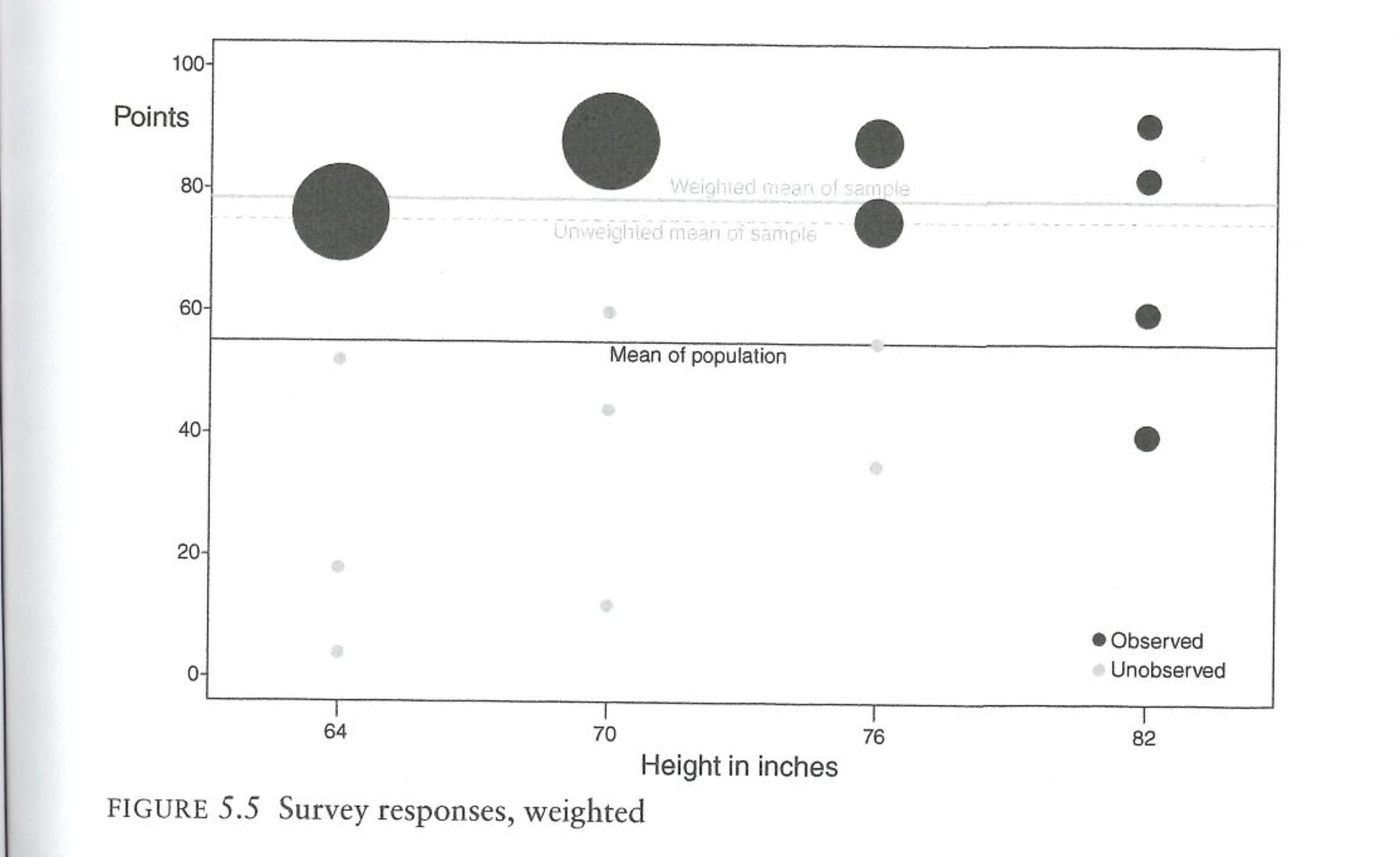 Unfortunately, this does nothing to fix the problem. Because we cannot weight to athleticism, we are not actually correcting for the fact that we have a non-representative sample. Indeed, only weighting on height here actually makes things worse! The tall players are actually fairly representative of all tall people, so that’s not a problem. But the short people we have in the sample are the extremely athletic people. By weighting to height we are saying: there are too few short people in this survey, give those people more weight. But then we are up weighting a very athletic group of short people to be representative of the non-athletic short people (me).