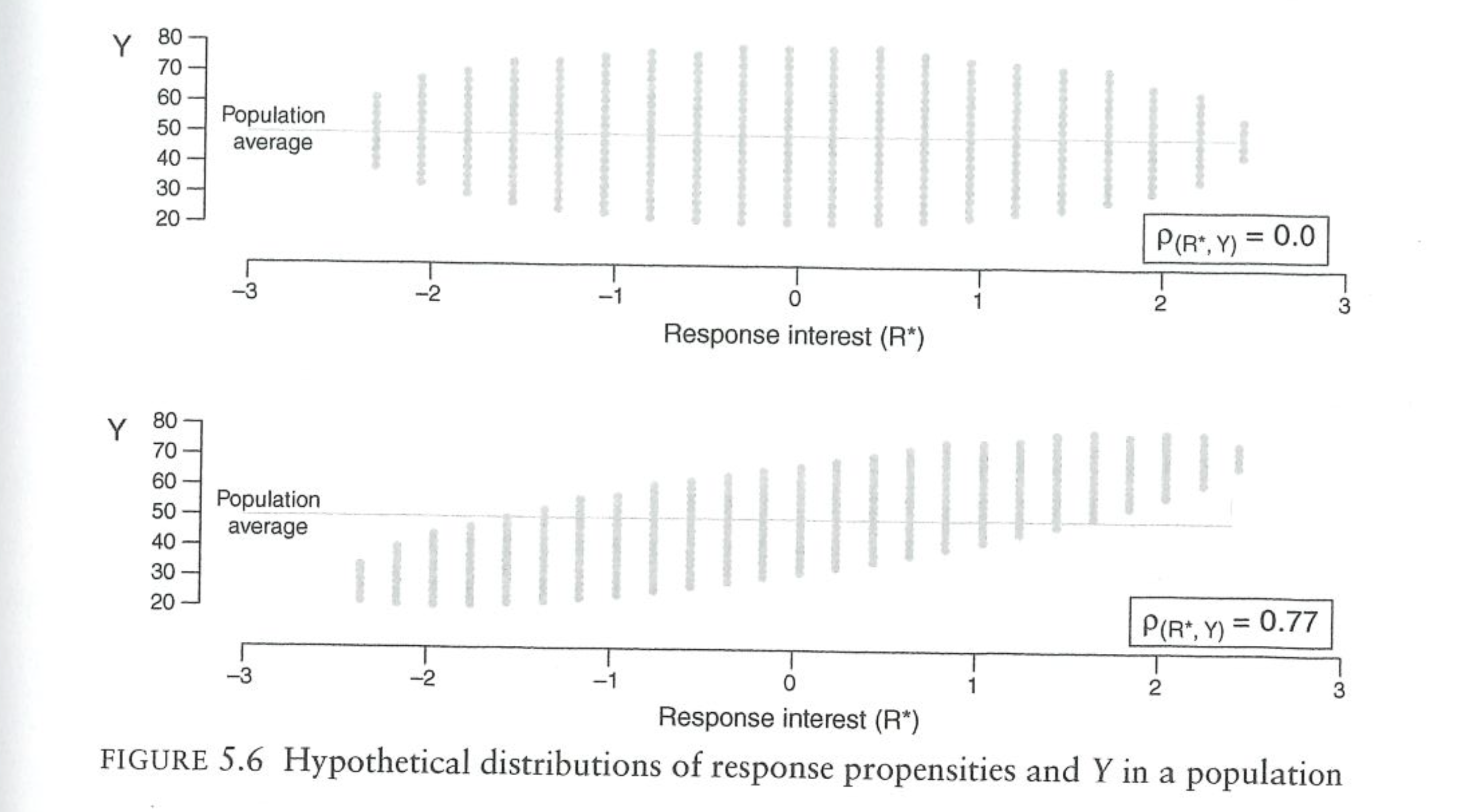 First consider the top panel. On the x axis are people’s latent interest in responding. The scale of this doesn’t matter, but we can think of very keen responders on the right side of the graph, and very reticent respondents on the left part of the graph. On the y-axis is the respondent’s values for whatever we are measuring.