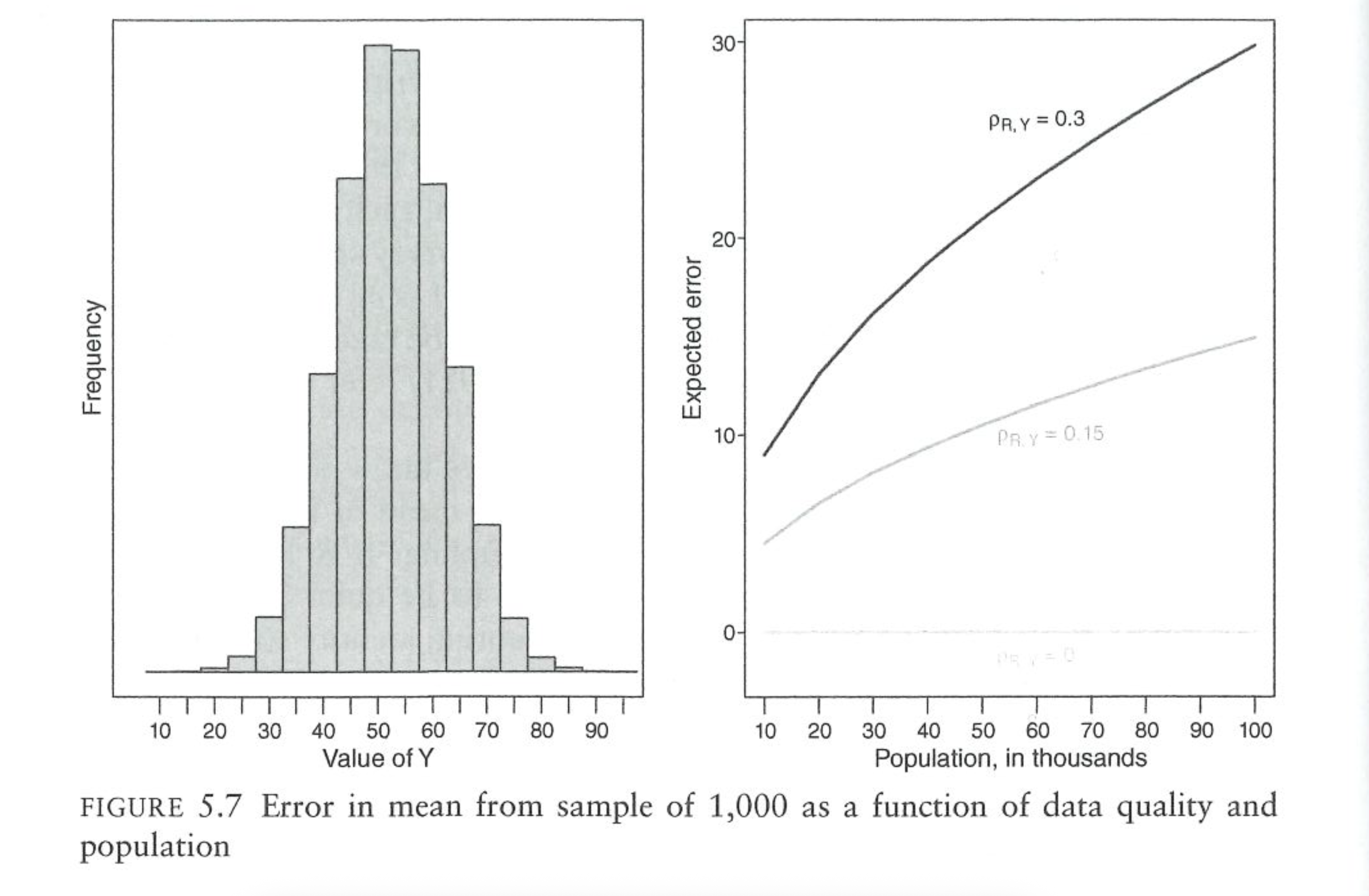 The first input that generates error is what we’ve discussed already, the “data quality”, which is simply the correlation between the who responds \(R\) and the outcome of interest \(Y\). This is the tilted fish in the diagrams above.