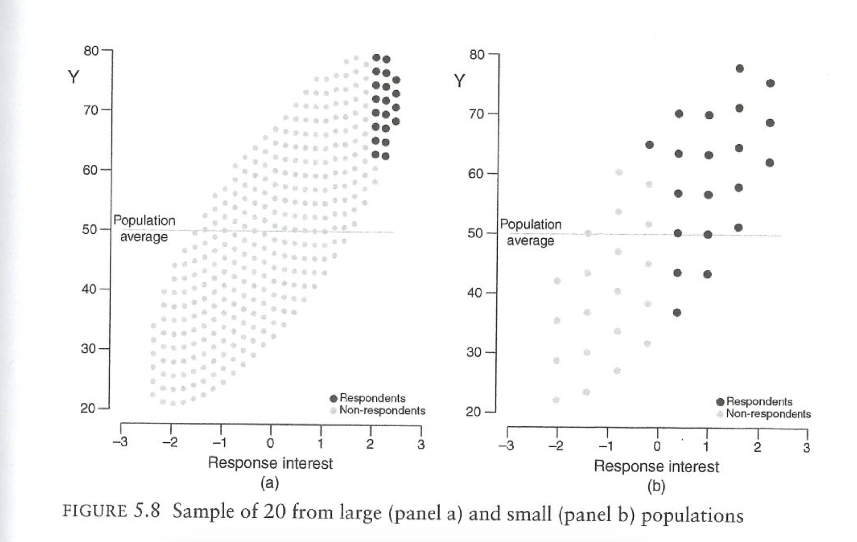 Bailey also gives a visual of why this “large population” problem exists. Imagine taking a sample of 20 people from a large population or a small population. In both cases the most eager participants (like students straining their arms raising their hands) will be the ones who end up in our sample. Even when the correlation between response and the outcome is the same, the “20 most eager people” in a big population are proportionally much weirder than the “20 most eager people” in a small sample.
