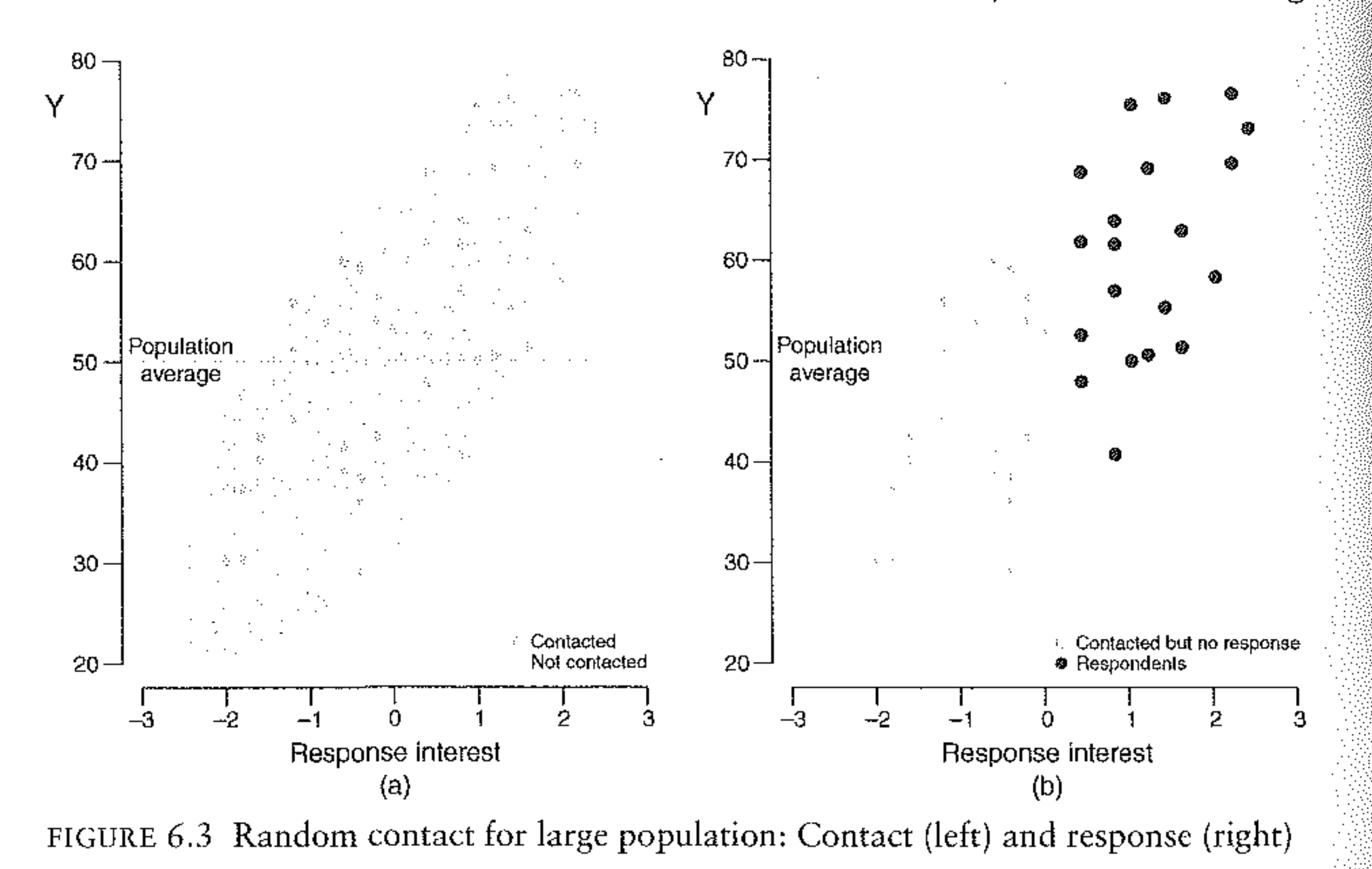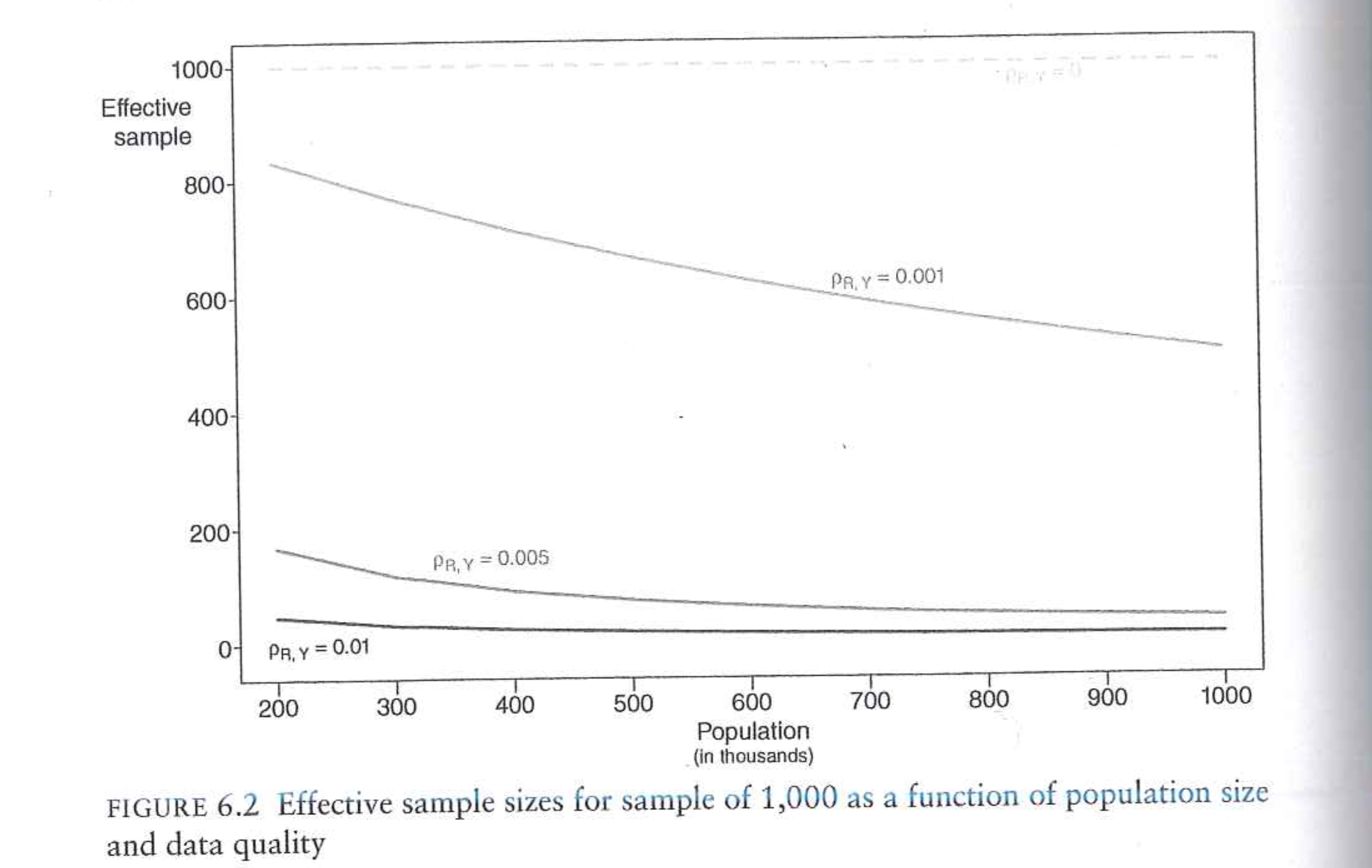The middle term is the most important in actually generating bias, and operates in a way that is counter-intuitive to what we learned in the sampling chapter. We previously discussed how, for a random sample, the population size is irrelevant when calculating the amount of error. What this term tells us is that when there is NINR then the size of the error that we make is in part a function of the relative size of the sample and the population. The smaller the sample is relative to the population, the more NINR will create bias.