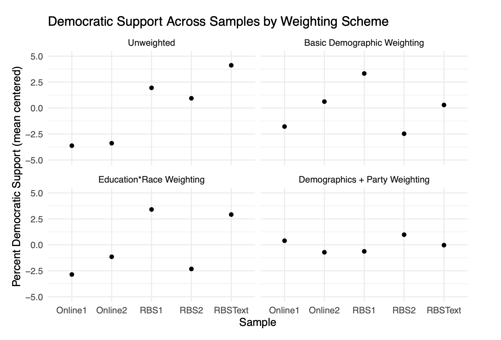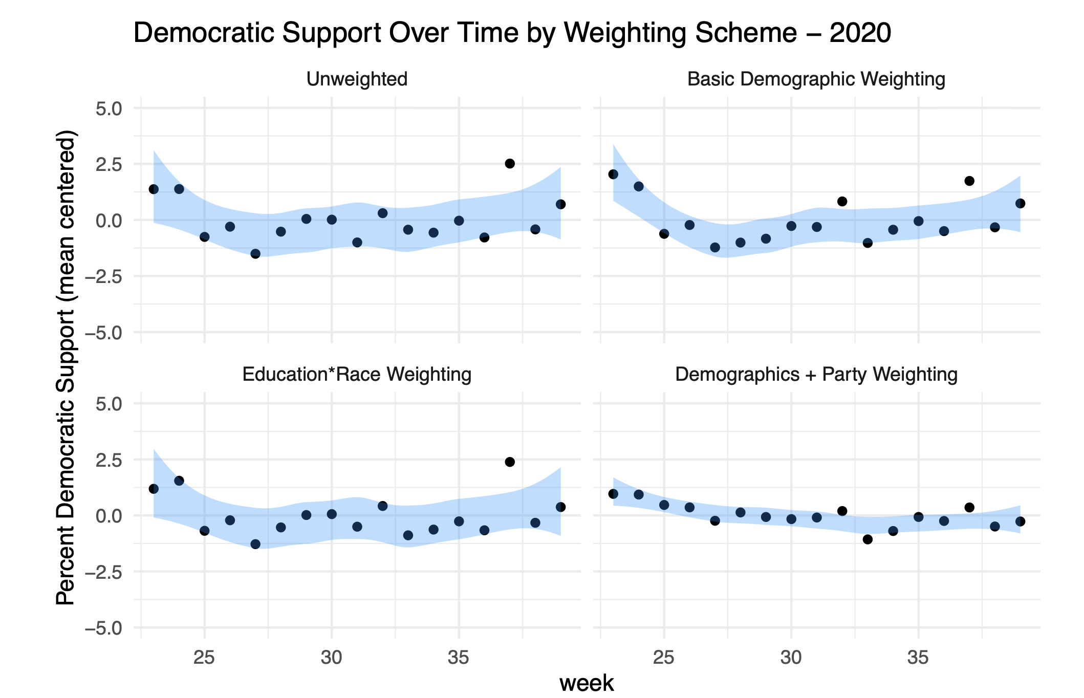 Some of this variation is due to basic sampling error, and some might be due to variations in who responds to the poll week-to-week. To try to understand the next three panels apply different weighting schemes to see the degree to which the variation is reduced.