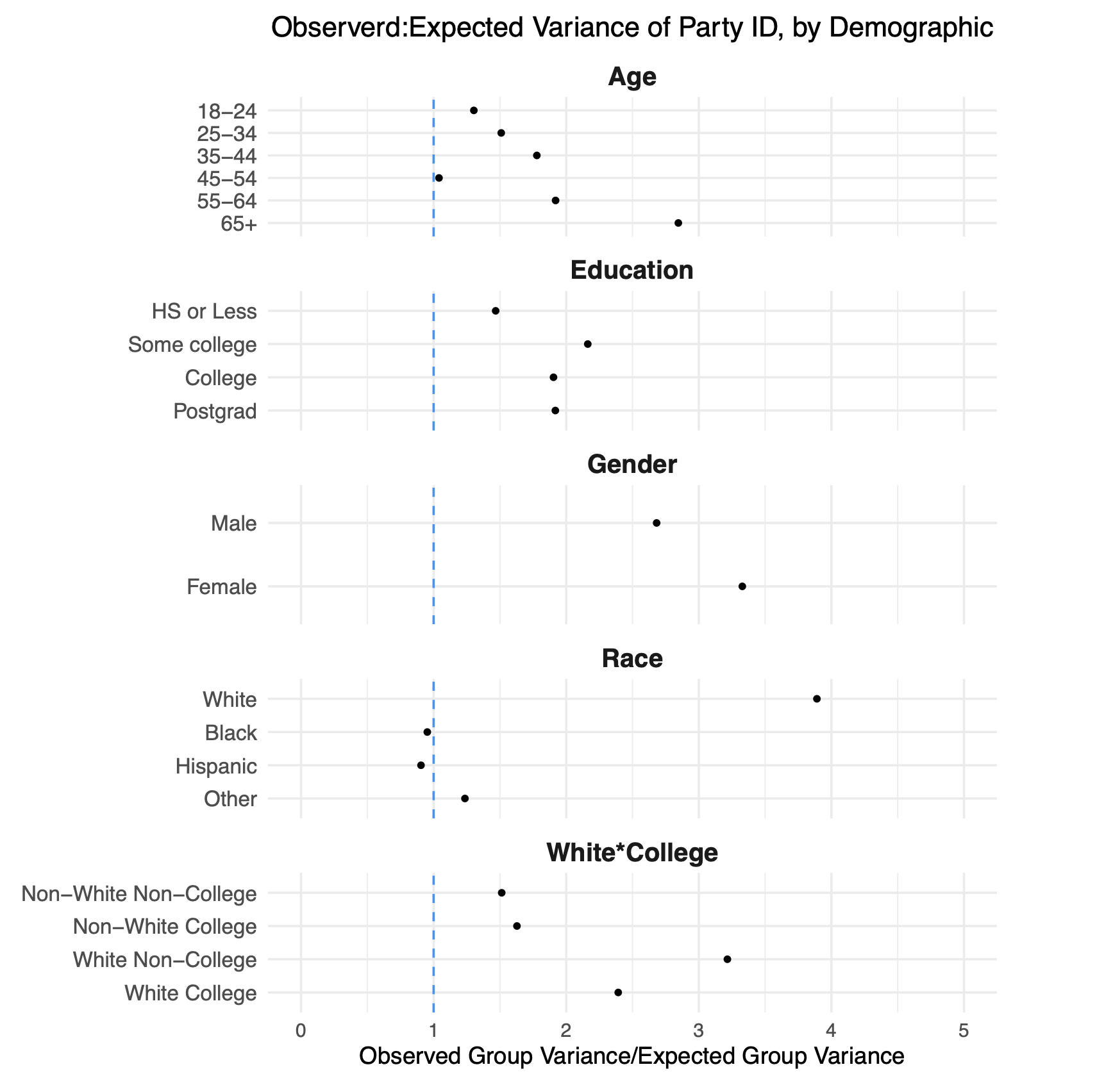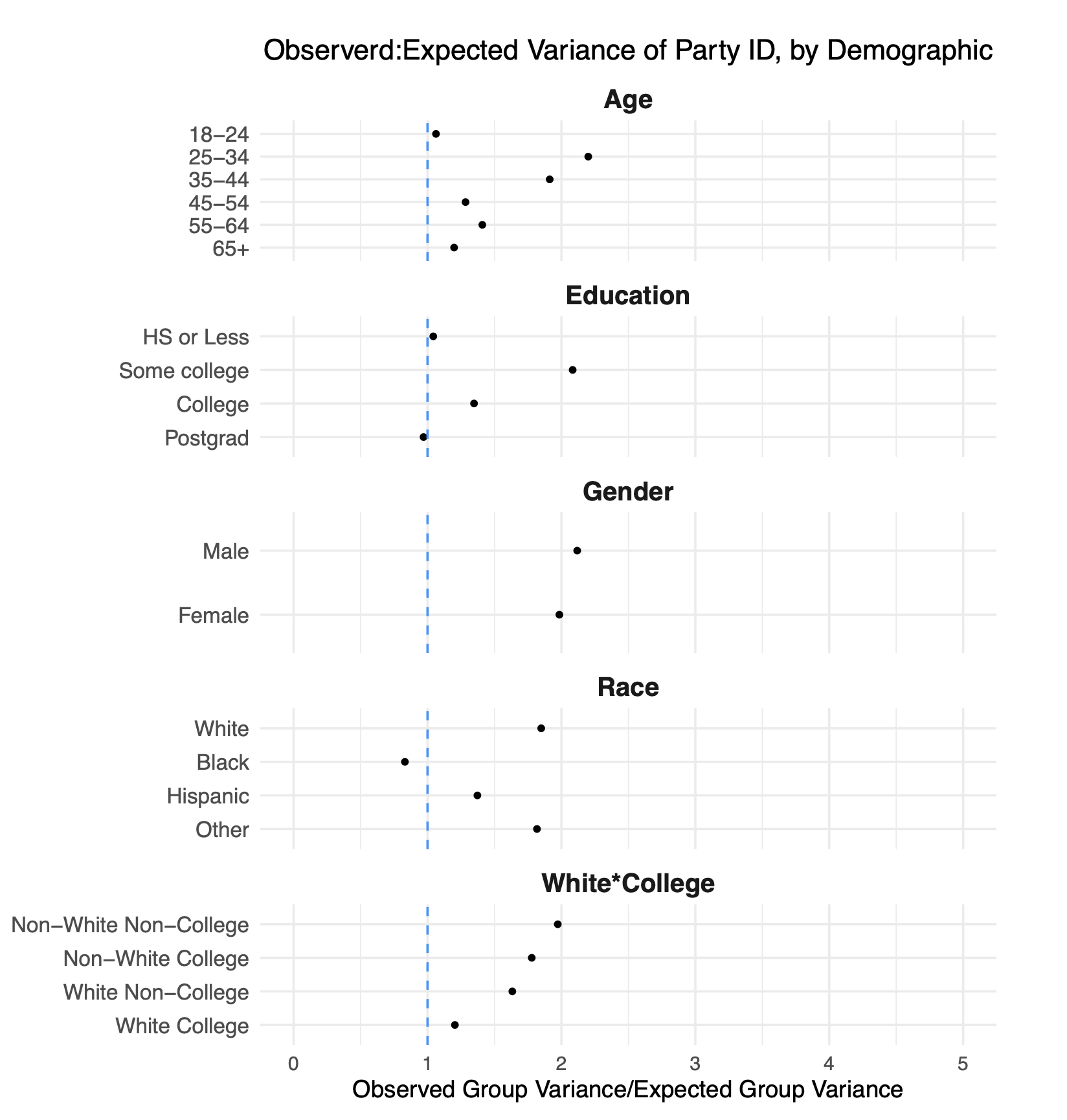 What is represented on each line is the ratio of these two numbers. Numbers above 1 tells us that there is within-cell variation in partisanship that is above and beyond what we would expect due to simple random sampling error.