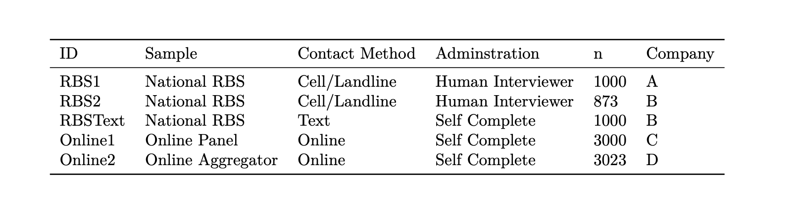The second source of data is a unique data collection excerise we undertook last year, where we contracted with 4 survey firms at identical times to field an identical survey with an identical sampling frame. These data hold constant time and instead vary the survey mode to create variance.
