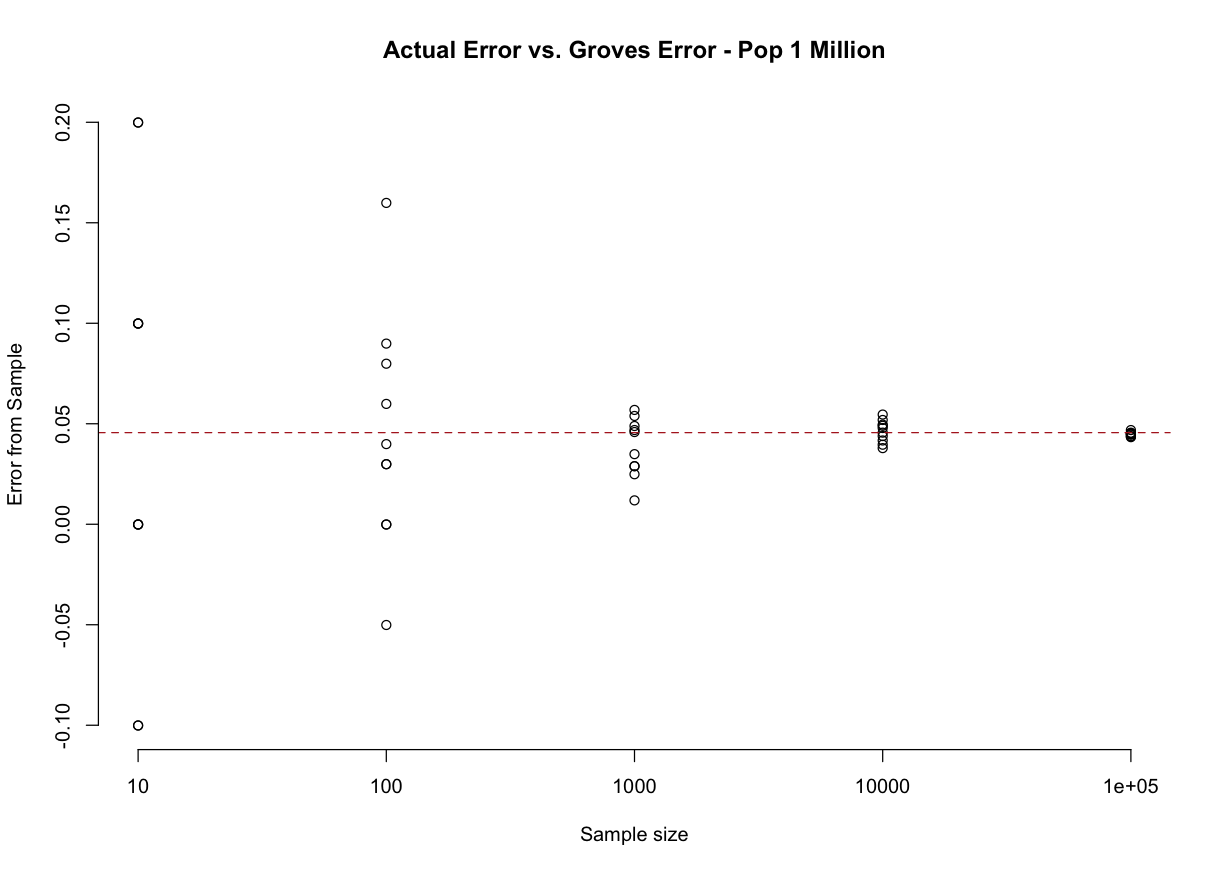 Here is a figure that shows survey errors across 5 different sample sizes from a population of 1000. The red dotted line is what we calculate from the Groves equation: