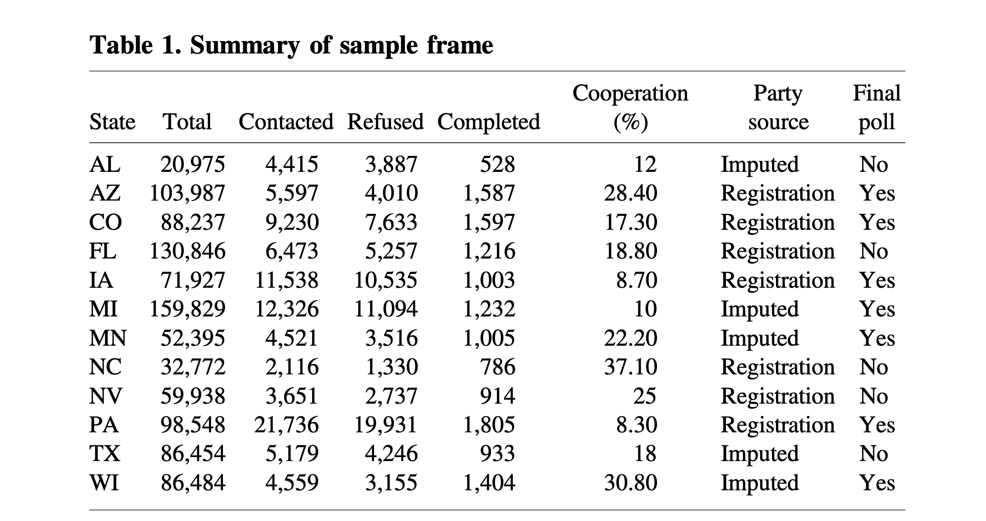 In this paper we are looking at the cooperation rate, which as a reminder, is \(\frac{Completed}{Contacted}\). This is preferable to the response rate (\(\frac{Completed}{Total}\)) or contact rate (\(\frac{Contacted}{Total}\)) because it is the quantity that is the most clearly impacted by personal/political decisions. We have this person on the phone, do they want to participate? It’s at that point that “politics” may enter the process.