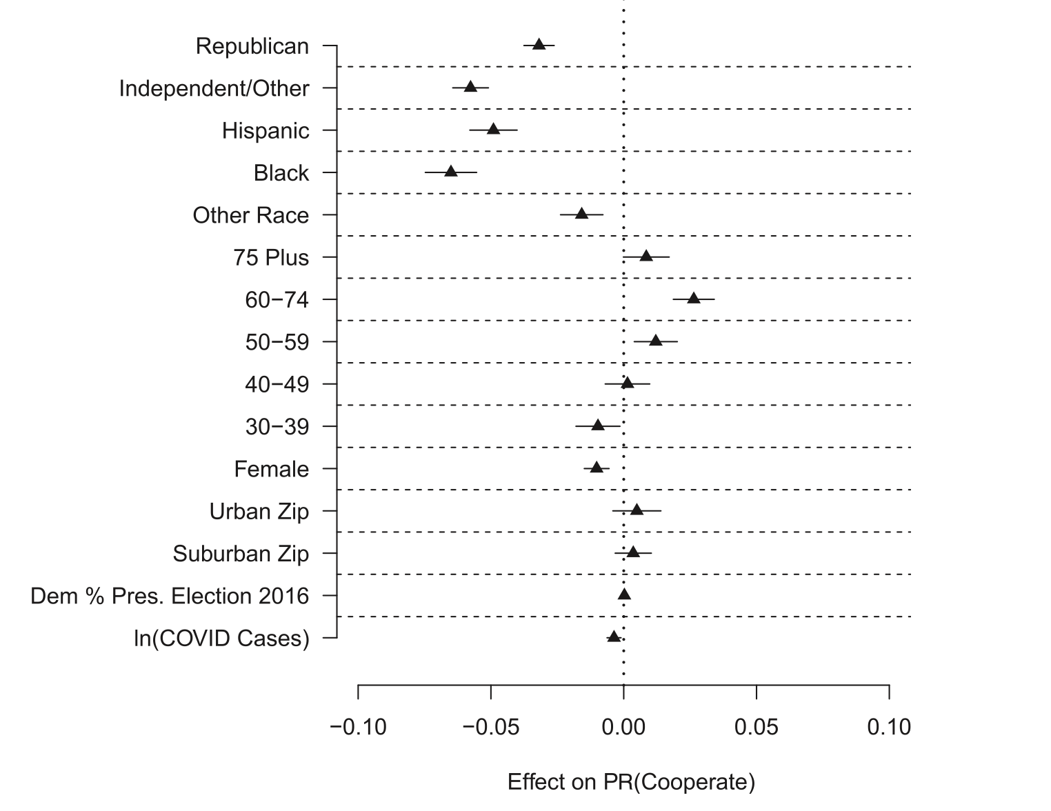 We are predicting the probability of cooperation based on indicator variables for Republicans and Independents (Democrats will be the “base” category here). \(X\) represents a matrix of individual level charecteristics that will be controlled for (we will see them in the figure below), and \(G\) represents a matrix of geographic control variables. Inclusion of these control variables are important because if, for example, young people are less likely to participate then older people, and young people are more likely to be democrats, it might appear that there is a relationship between party and cooperation that is really just a function of age. Additionally, this regression is estimated with “state fixed effects”. The math behind this is not important, but the intuition is that the regression is only going to look at the effect of partisanship (and all other variables) within states. So the results below cannot be explained by a more Republican state having a lower cooperation rate than a Democratic state.