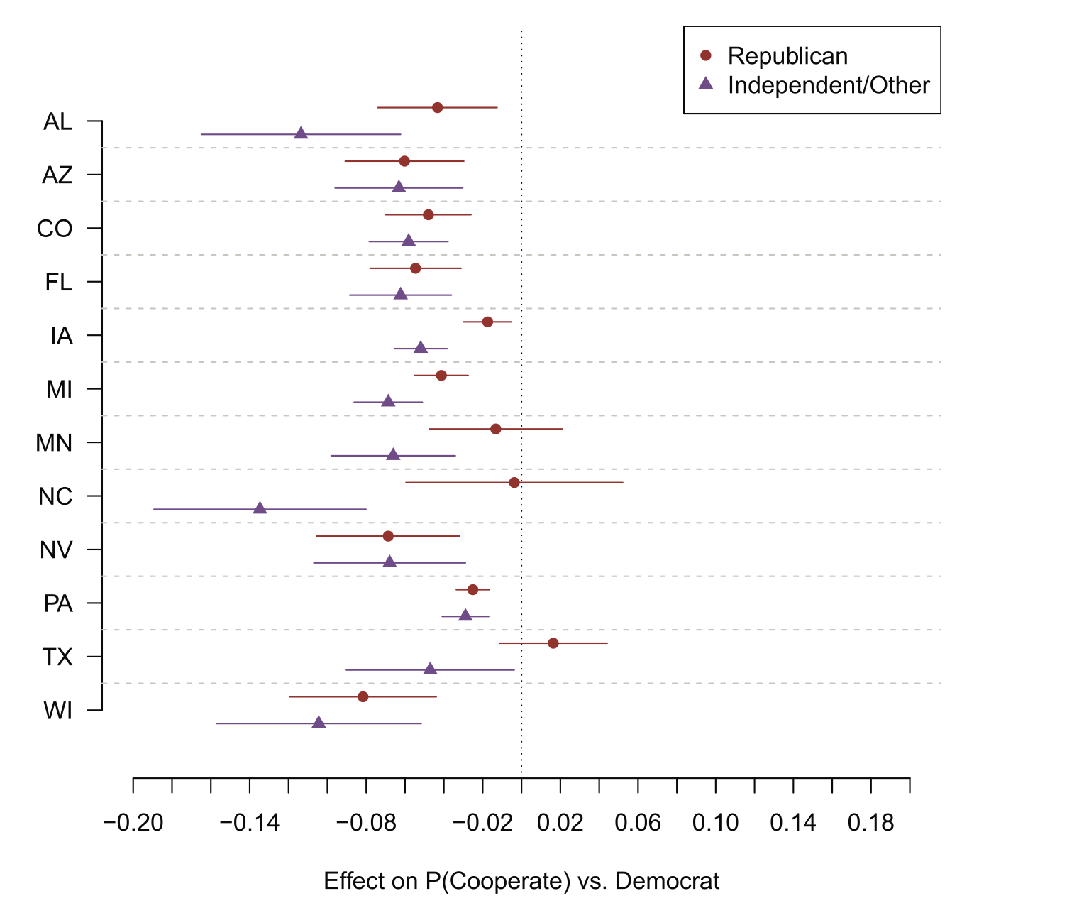 There is a remarkable consistency to this result, where Republicans in each state (except Texas, Minnesota and North Carolina) are less likely to participate than Democrats, and Independents are universally less likely to participate.