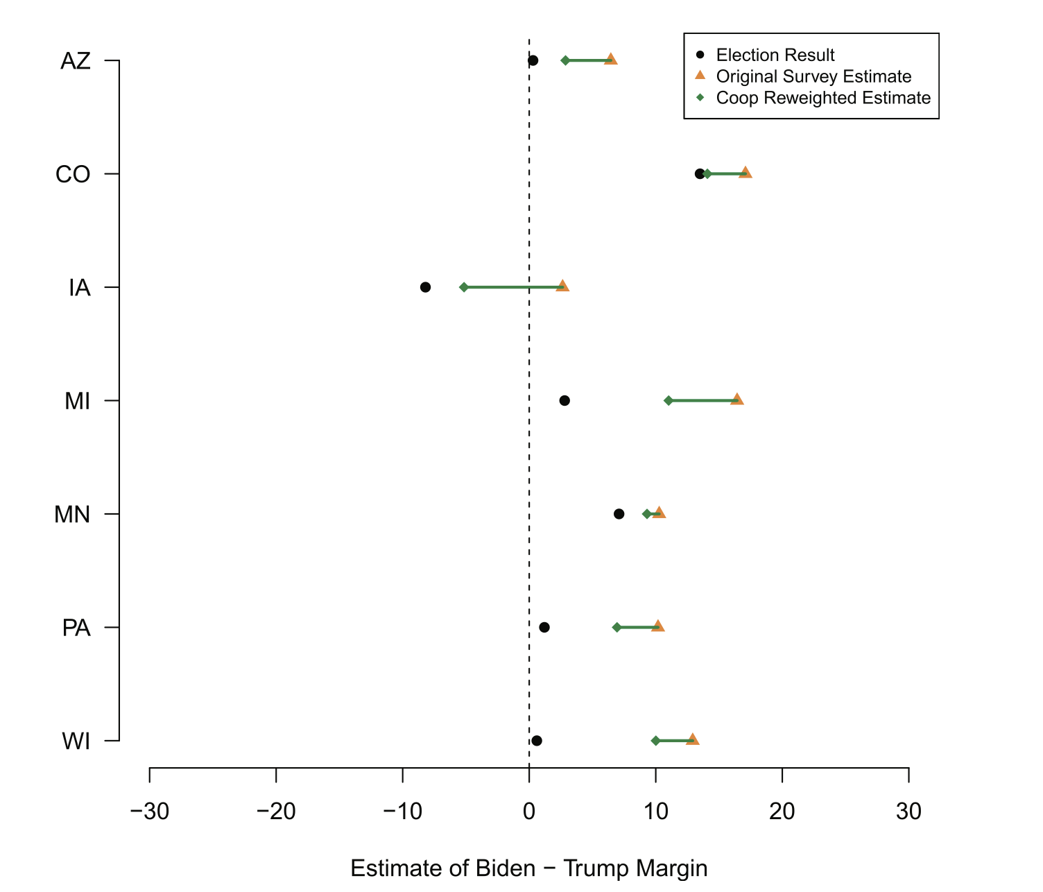 The results of applying those weights are here, where the original survey estimate is in yellow and the adjusted survey estimate is in green.