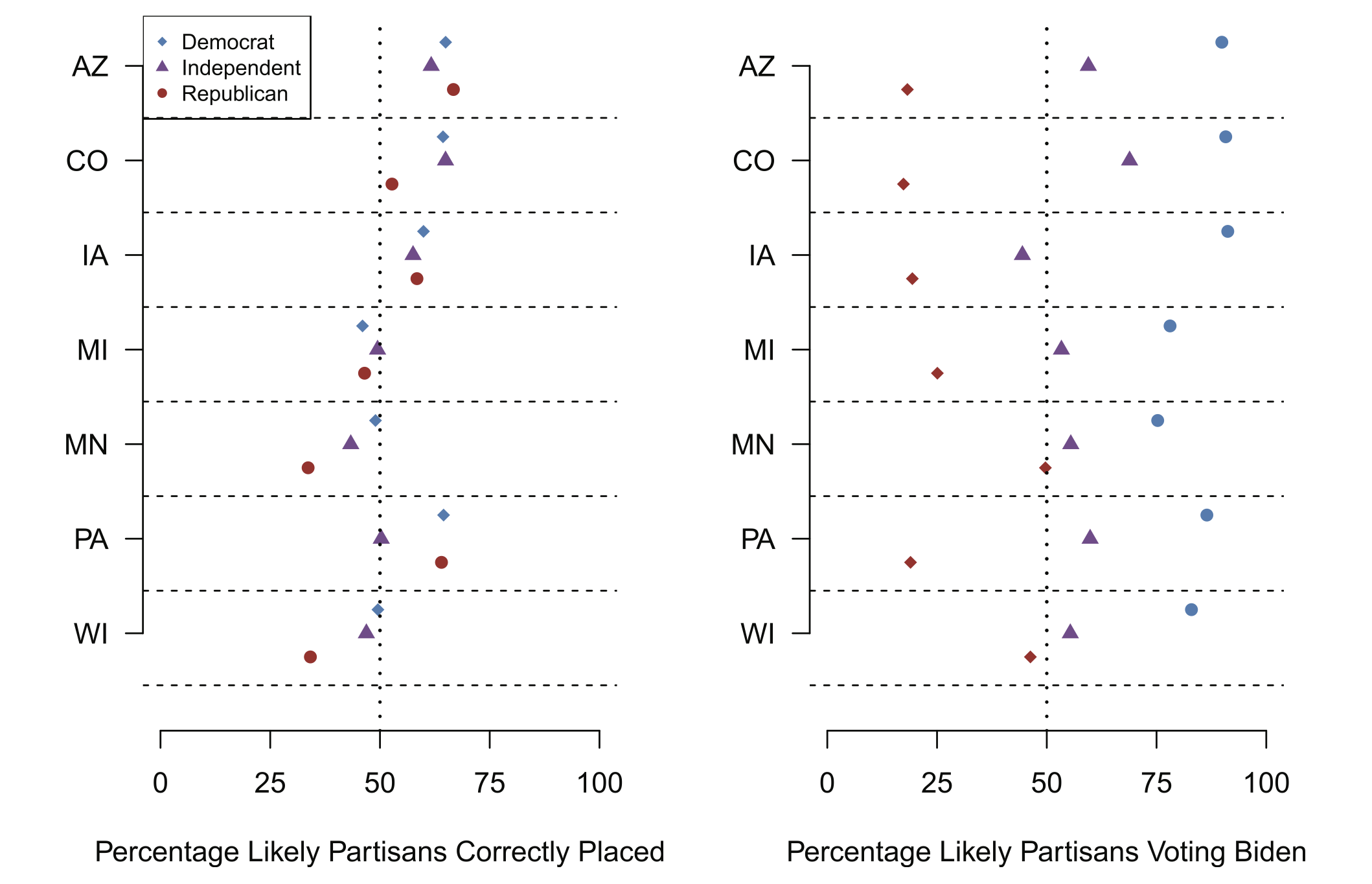 In the left panel we measure the degree to which likely partisanship matches up with self reported partisan ID. Do people with Democratic party registration report being Democrats? Do independents report themselves as Independents. The results tell us “kind of”, with significant variation. Arizona, for example, has really good match rates. Around 60-70 percent of likely Democrats say they are Democrats, etc.