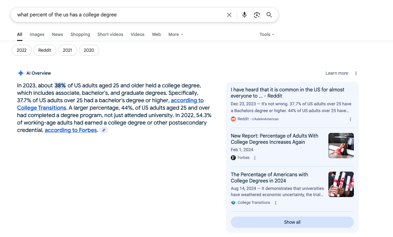 I can find out that 38% of the US has a college degree.