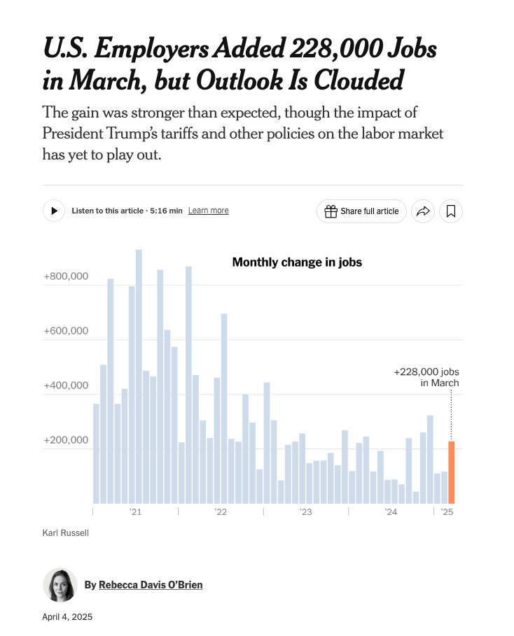 Here is a NYT article from April on the job report. It says that in March 2025 the US added 228 thousand jobs and the unemployment rate rose from 4.1% to 4.2%.