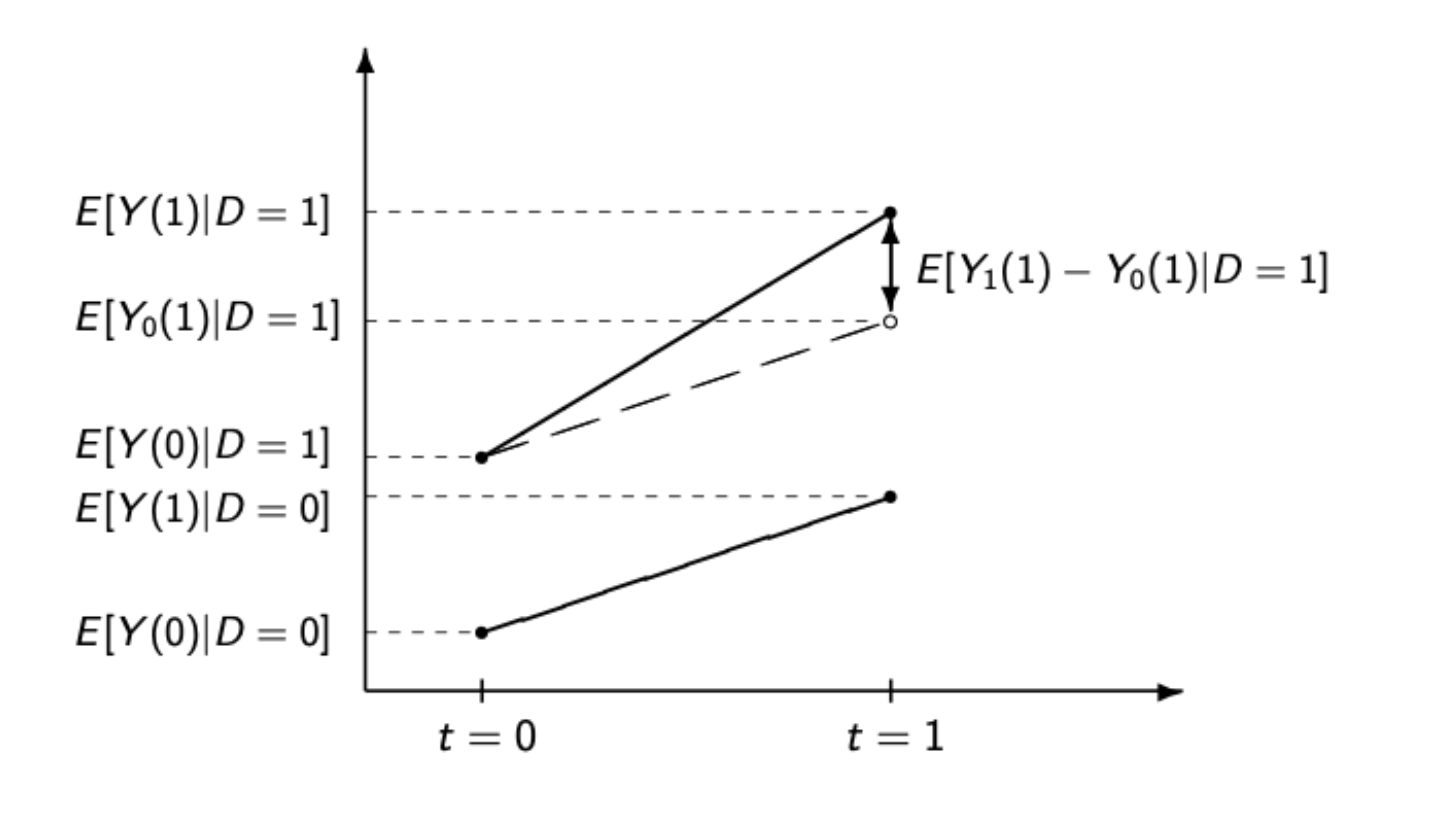 This second image visualizes what we are doing with DiD. The way that we make use of the control group is through the Parallel Trends Assumption. We assume that the trend in the control group is indicative of what would have happened in the treatment group if it had not been treated. The slope of the dotted line is the same as the slope in the control group. In other words, our counterfactual for what would have happened in the treated group absent treatment is just the change in outcome in the control group.