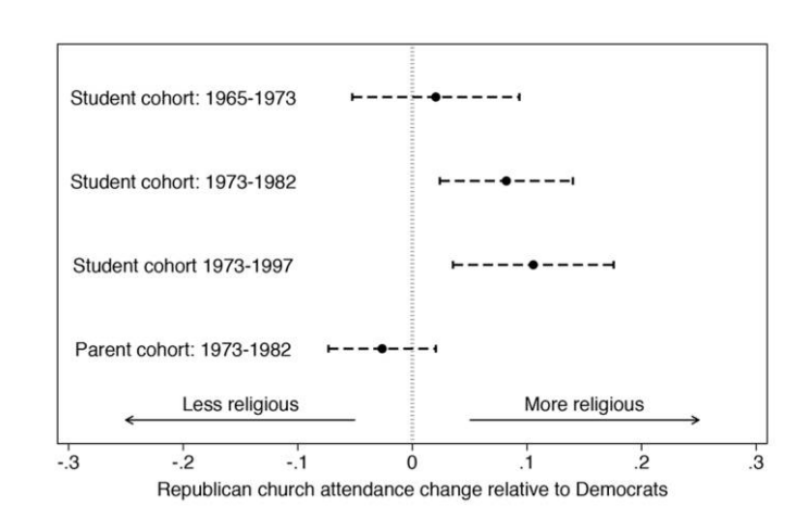Up until this article the prevailing hypothesis was one of sorting. As the two political parties became more polarized on religion in the late 20th century, religious people increasingly found a natural home in the Republican party, and non-religious people found a home in the Democratic party. From this perspective, people’s religiosity is a constant identity that drives them to make decisions about politics.