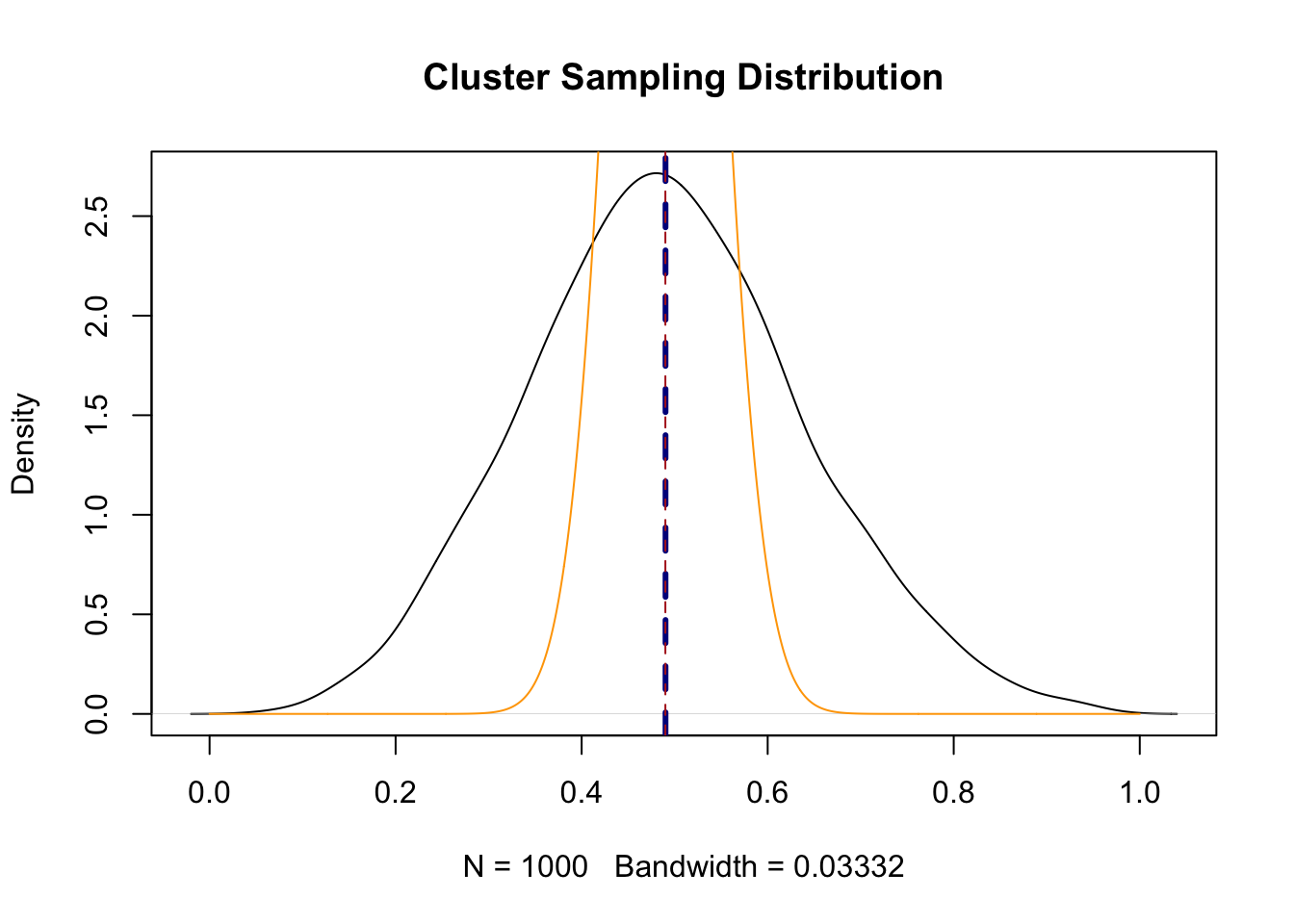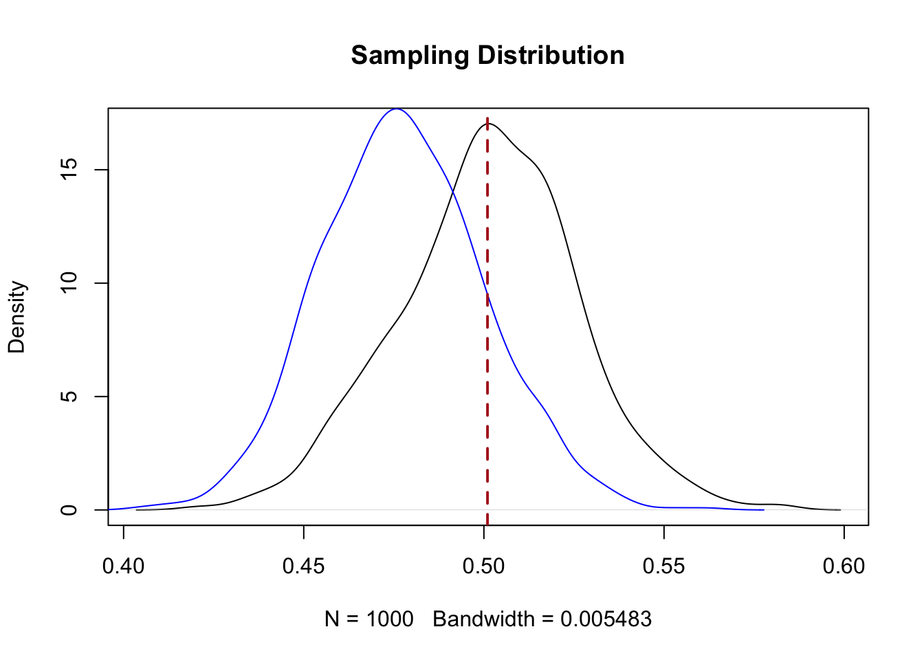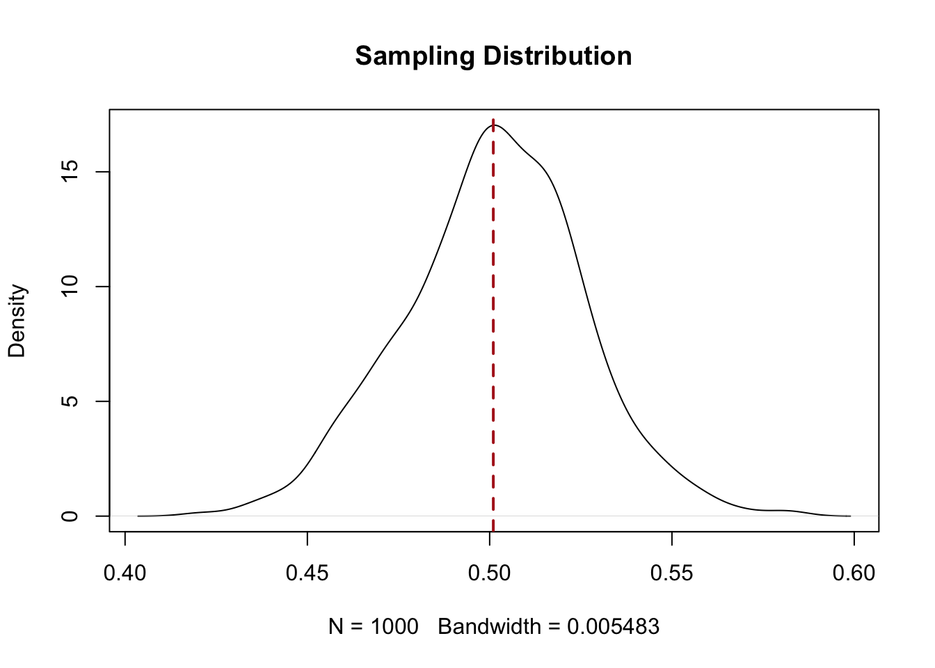But if we do that the sampling principles will apply from above. The sample mean will be unbiased, and the standard error will be \(\sqrt{\frac{.25}{100}}\).