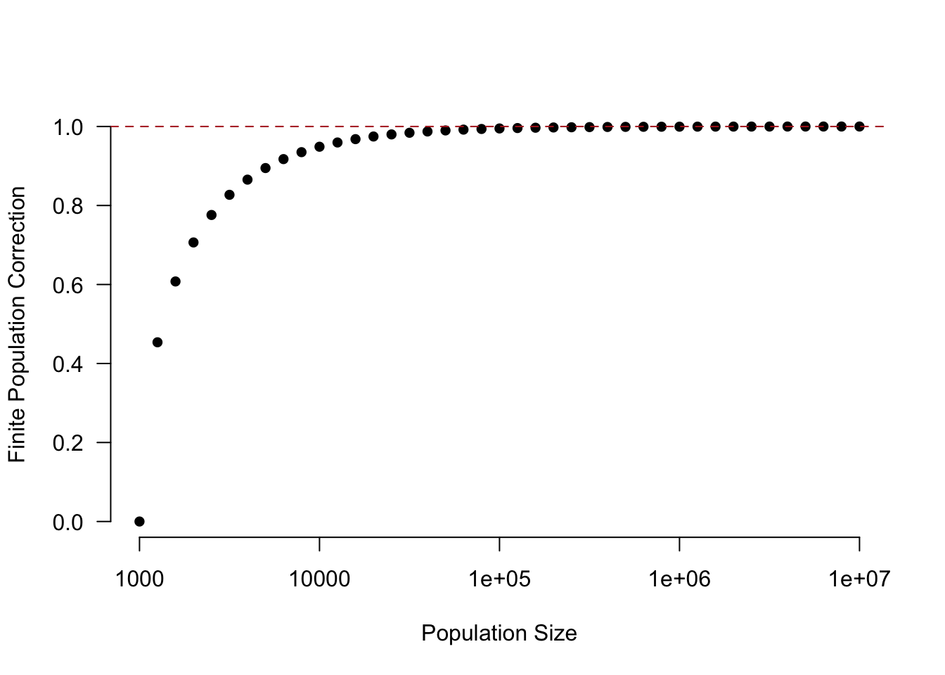 For a sample size of 1000 once our population gets to around 100,000 the finite population correction is effectively 1. In other words, once we are at this level then there is no point in worrying about it anymore. That’s why when we think about doing a survey of 1000 people in Canada (approx 30 million people), the US (approx 330 million people), and China (approx 1.5 billion people) there is no need to apply the finite population correction, because it would be approximately 1 in all of these cases.