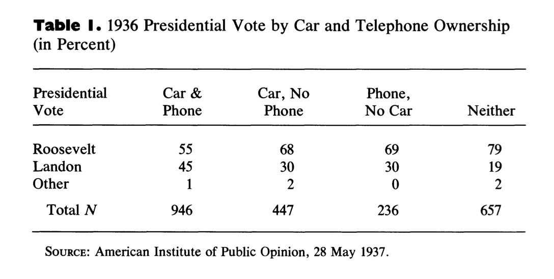 The first table looks at vote choice by these two variables. As the article discusses, because this poll was taken after the election, we expect that all of these numbers are probably a bit too high for Roosevelt. There is (or was, it’s probably less prevalent now) a consistent “winners effect” in post election polls where more people recall or report voting for the winning candidate than really did. Regardless, in every category Roosevelt, not Landon, is the preferred candidate. This is the first clue that it’s not just coverage error that caused the polling miss. For that to be the case there would have to be at least some group here who preferred Landon or Roosevelt. However, we do see that as someone is less likely to be in the sampling frame (not owning either a car or phone) they are more likely to support FDR. This is evidence that the people not in the samplign frame had different opinions (more pro FDR) than those in the sampling frame.