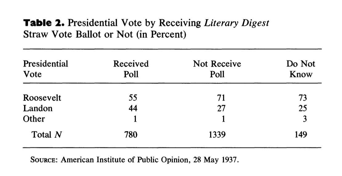 We can’t see the sampling frame directly here – but we know that Literary Digest used car registration lists and telephone books, which means that people without a car and phone were less likely to be covered by the poll.